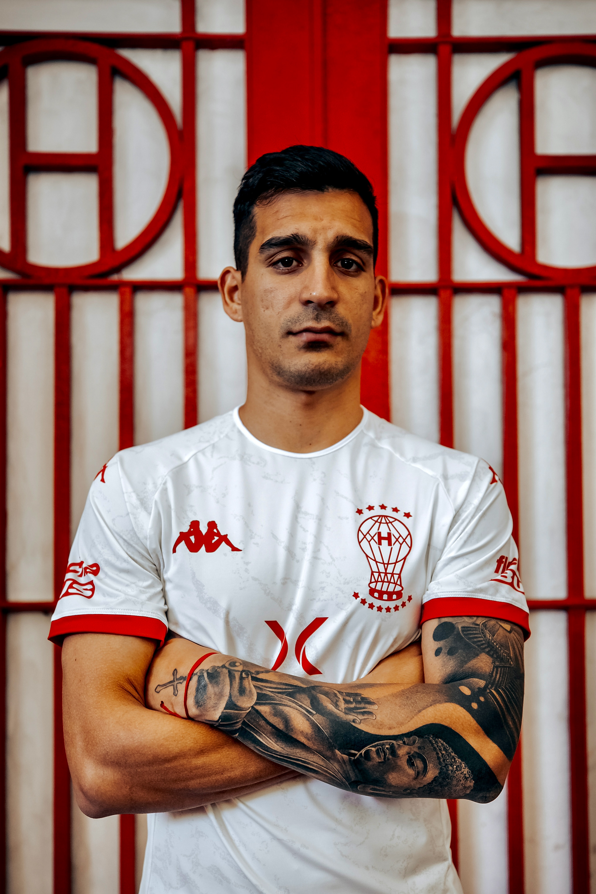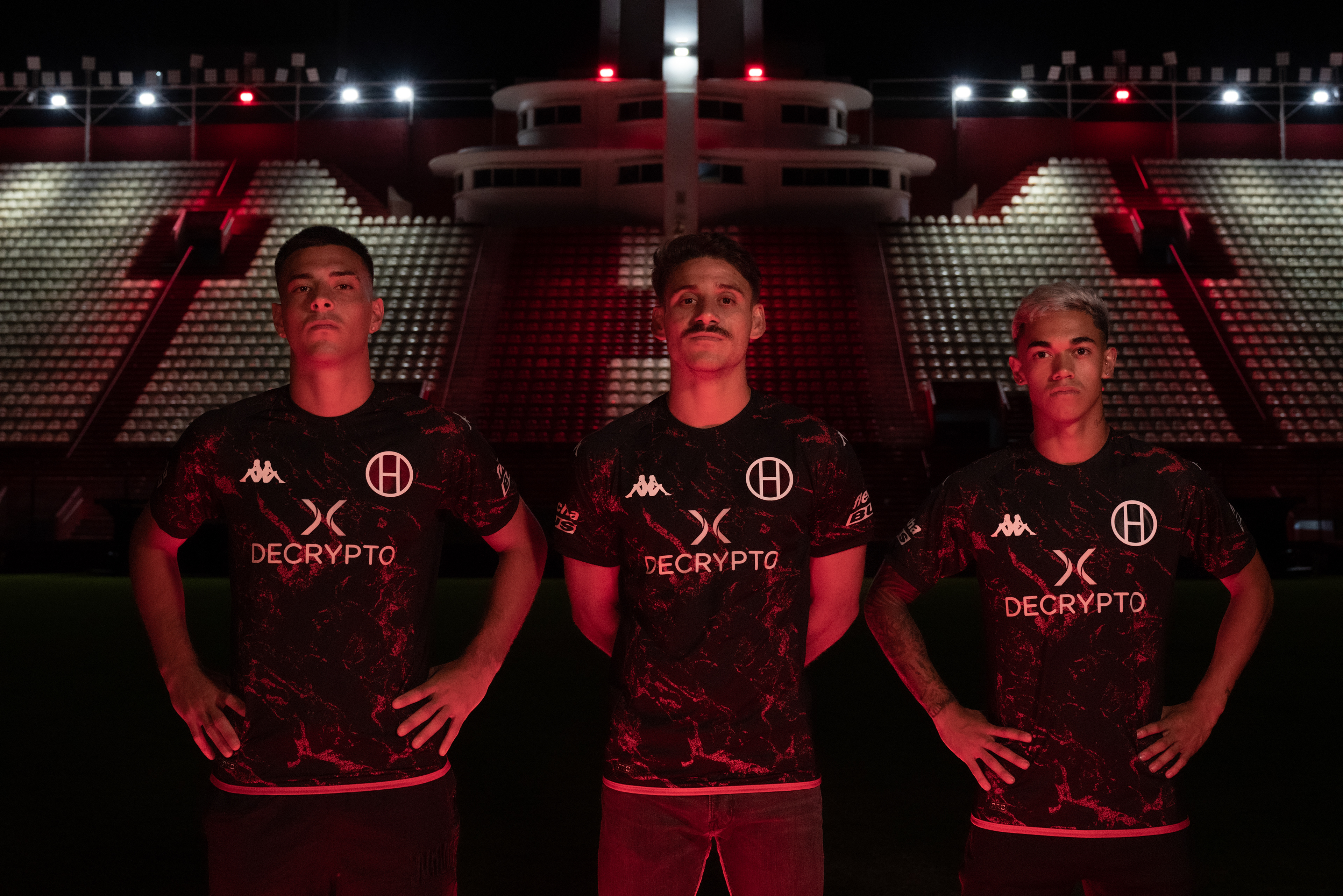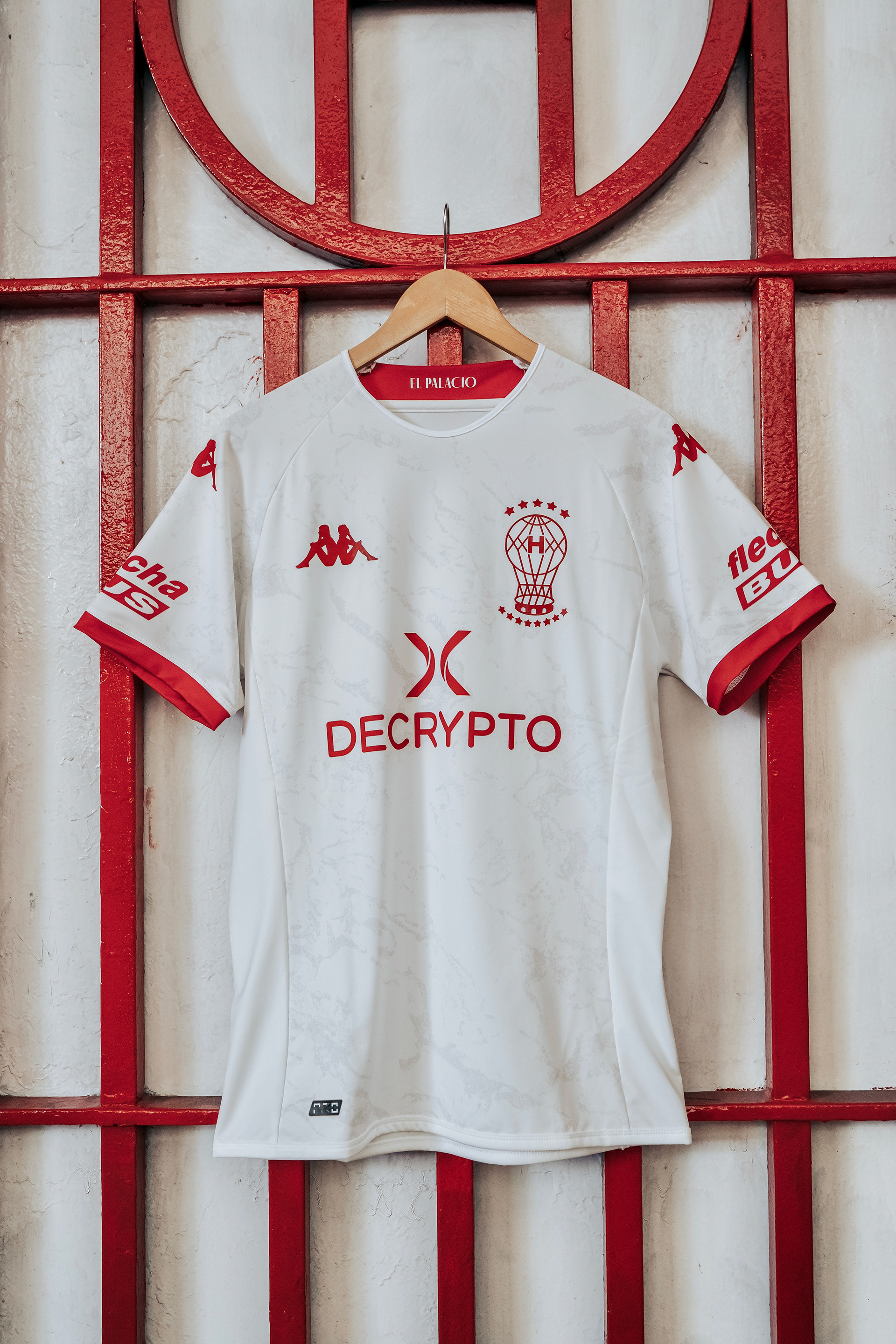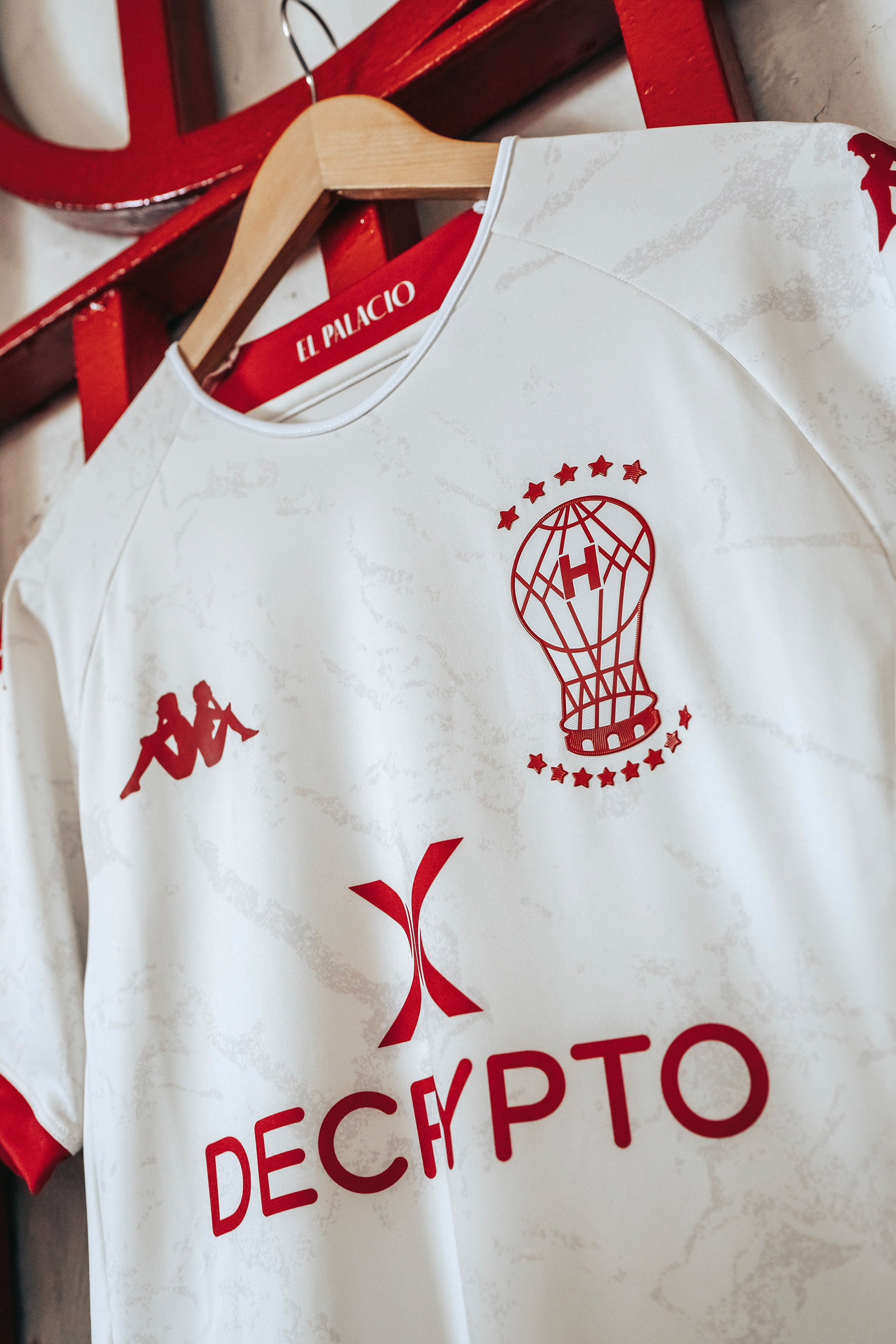 Tercera camiseta. Se repite la textura de mármol pero en este caso en negro y rojo generando un alto nivel de contraste e impacto. Como gran novedad, se reemplaza la clásica insignia del globo por el símbolo de la H contenida por un trazo circular, tal como el que se encuentra en los portones del estadio.